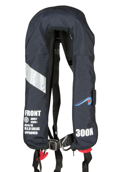 Chaleco salvavidas automático 300N con arnés de cubierta incorporado y hebilla de acero inoxidable.